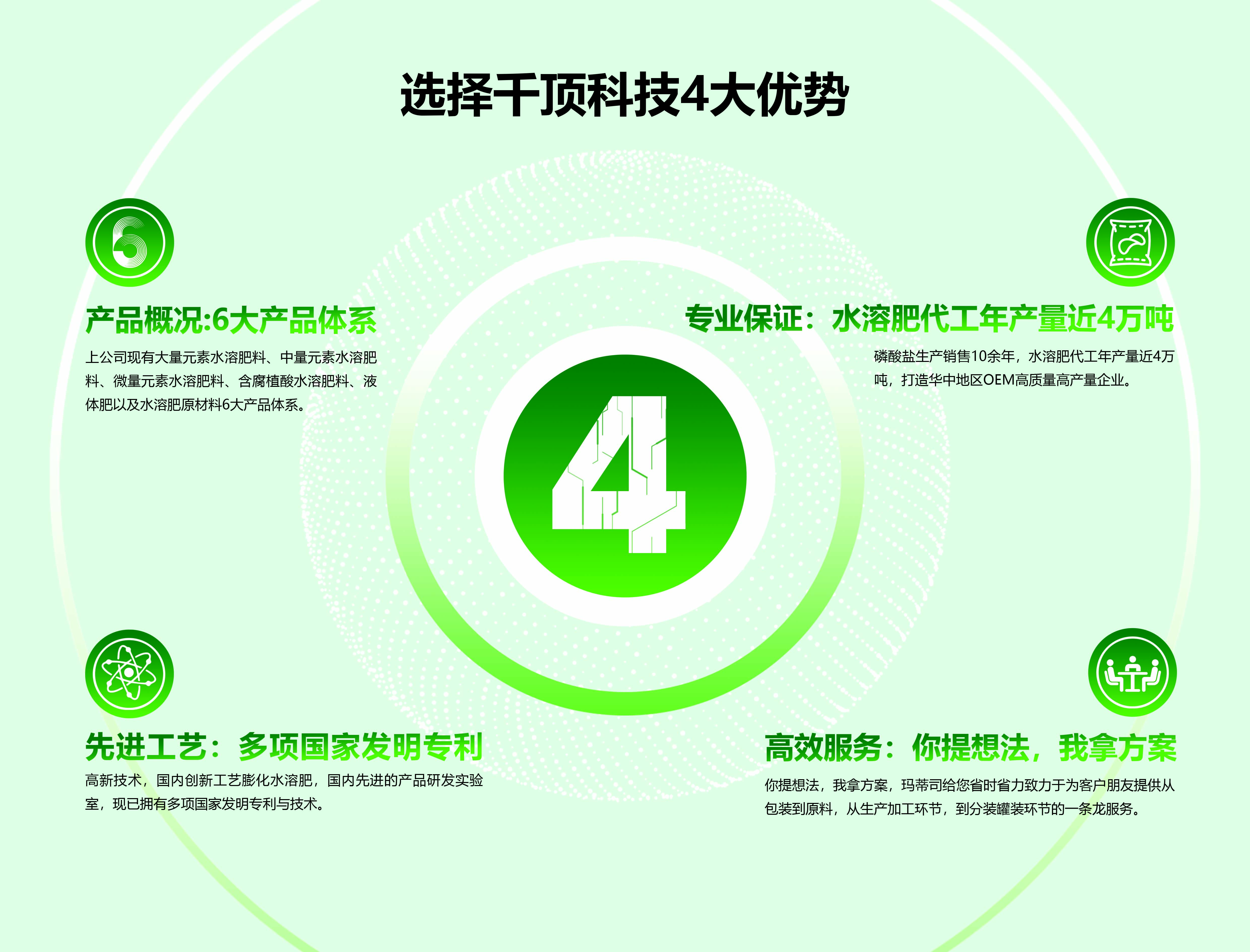 湖北千頂科技有限公司位于九省通衢,美麗的江城武漢,是一家專業(yè)從事研發(fā)、生產(chǎn)、磷酸鹽和高端水溶肥等一體化工企業(yè),是一家致力于打造農(nóng)業(yè)與工業(yè)攜手進(jìn)步的化工企業(yè)...